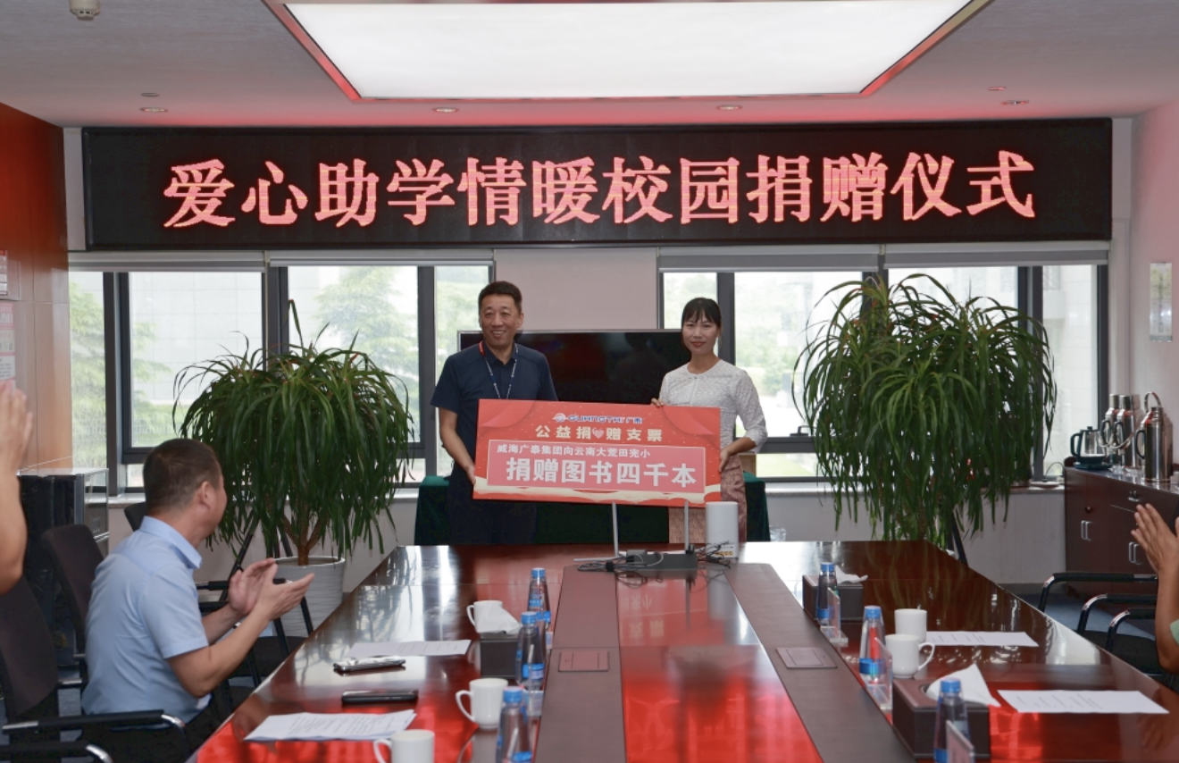 近日,云南大荒田駐村第一書記趙偉率云南大荒田完小校長李梅一行11人來訪威海廣泰,李文軒董事長一行熱情接待并在大廈三樓會議室進行了“愛心助學(xué)·情暖校園”捐贈儀式。李文軒董事長代表廣泰公司向云南大荒田完小捐贈30萬元助學(xué)基金,并代表全體廣泰員工將6月1日捐贈的4000冊愛心圖書一起轉(zhuǎn)交給李梅校長。